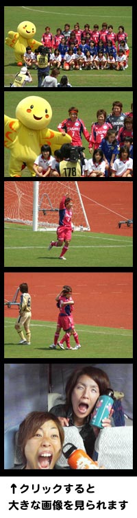 こんにちは~。8月27日のなでしこオールスターはたくさんのみなさんに投票して頂いたおかげで出場することが出来ました!ありがとうございました!オールスターは普段は敵として戦っている選手と一緒にプレー出来るとあってやはり楽しいものなのでその場にいられる事は本当に幸せでした!試合の前日には前夜祭があって、普段ニユホーム姿しか観たこと無い人もこの時ばかりは、みんなビシッと決まってて試合とは違う面をみれた気がしました!なかでも、10番同士ということで澤さんとあやがドレスアップして登場すると会場はかなりどっと湧きました(^O^)それと例のアレ。私自身が皆さんから選んでもらって観にきてもらえるということで、プレーはもちろんなんですが、やはり楽しんでもらいたいと思って考えた結果が、あの入場でした(^^ゞあれは一週間くらい前から考えていたんですが、ズラは当日の朝、磯さんと一緒にハンズに買いに行って用意しました(^o^;なかなか良いズラがなくて、アフロとかはあるんですけど、ロナウジーニョのはさすがになく、しかたなくロン毛を購入し磯さんと試行錯誤しながらゴムで縛って完成させました(^^)v入場するときはさすがに緊張していて、みんなの反応が分からなかったんですが、アナウンサーのキクちゃんに『湧いてましたよ』と言われたときは恥ずかしかったけど喜んでもらえて良かったとホッとしました(^o^;試合はレベルの高いプレーが随所に出ていましたがやはりEASTのボール回しはさすがでWESTは守備でいっぱいいっぱいでした(^o^;でもそれは試合前に話して分かっていた事なのでメンバーのみんなも納得ずみでじゃあ自分達はその裏を突いていこうと言ってたらその通りに点が入って凄く嬉しかったです(^O^)途中に原ちゃんが得たフリーキックについて試合前のロッカーでの、あや、原ちゃん、あこ(庭田)、そしてわたしの会話をお聞きください!!(わたし)『フリーキックさ~蹴る人が最初にまたいで、それから一人ずつ全員またいで最初の人が結局蹴るってのはどう?』(あや)『じゃあ蹴る人はその場でジャンケンで決めよう~』(原ちゃん)『うちそういうの弱いんだよね~』(あこ)『笑』こんな感じで話は決まって試合で得たフリーキック。実際は原ちゃんが倒されたから原ちゃん蹴りなよ!って事になっていざ作戦スタート!!原ちゃんが跨いで、私、あこ、あや、そして原ちゃん!ボールは枠を外れちゃったけどオールスターだから出来る事、そしてスタンドの歓声!!作戦を立ててて良かった~(^O^)決まったらもっと良かったけど(^o^;試合は前半1点、そして後半1点を私たちが入れ、その後1点返されたけど守り切って終了~!!MVPは大谷さんが頂いてきちゃってましたっ!!レッドブルー1年分もチームで頂き、良いことだらけのオールスターでした!!今週からはリーグが再開するのでそちらの応援もよろしくお願いします!(^^)v☆なでしこリーグ 2006 第8節 9月3日 スペランツァFC高槻 VS TASAKIペルーレ高槻市立総合スポーツセンター陸上競技場11:30 kick off!!FC第9節 9月10日 TASAKIペルーレFC VS 岡山湯郷Belle加古川運動公園陸上競技場14:00 kick off!! 関西地区にて、新商品「バスタオル」限定50枚 / 2,500(税込) を販売させて頂きます。 ※オールスターファン投票選出の感謝を込めて、新商品バスタオル購入していただいた全員の方に、6選手の直筆サイン入り写真(はがきサイズ)をプレゼントさせて頂きます!!