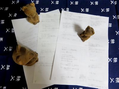 下に敷いた手拭いはすぎやま文先輩の東北土産です。