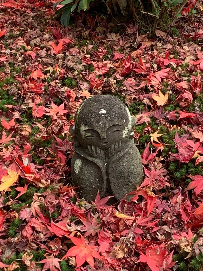 散紅葉・敷き紅葉の美しい庭園で、かわいいお地蔵さんを見つけたの。ほっこり癒される、お気に入りの一枚レッド、オレンジ、イエロー、グリーンのミックスカラーが美しい本堂の玄関脇にある「水琴窟(すいきんくつ)」ここで、外国人の女性が時間をかけて写真を撮っていたわニッポンの美を感じるわね。本堂の中からお庭を眺めると・・・額縁に入った一枚の絵のよう。角度を変えると、また表情が変わるの。お座敷に正座して、しばらくこの景色を眺めていたわ。格子窓越しにも紅葉 風情があってステキ~このお寺、また訪れたいわ。