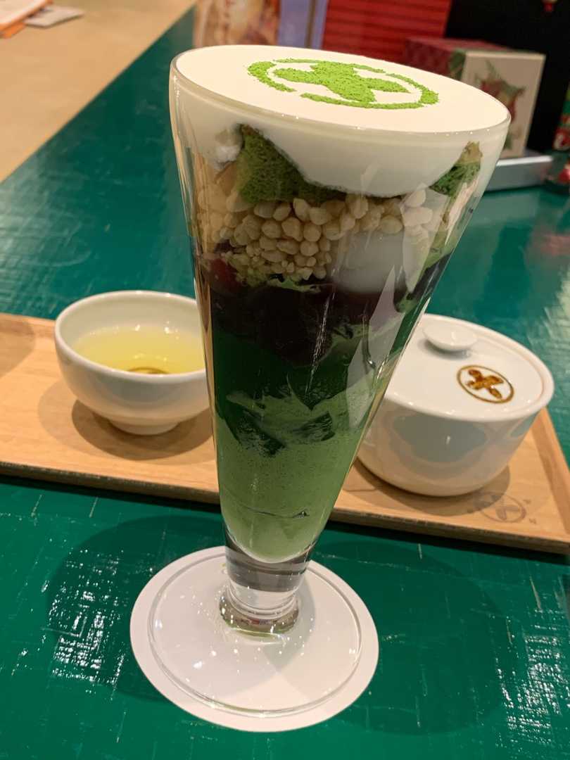 抹茶パフェ、第二弾は・・・「中村藤吉本店」安政元年(1854年)創業。京都・宇治に本店を構える老舗銘茶店だ。『まるとパフェ(抹茶)』 1,320円(税込)「まるとパフェ」は、2種類あり、「抹茶」と「ほうじ茶」。迷うことなく、「抹茶」を選んだ。オーダーすると、まずウェルカムティーとして、季節ごとのお茶がサーブされる湯呑みではなく、お湯の入ったポット・急須・湯呑みのセットで出てくるのが嬉しい。この時は「中村茶」で、香り漂うあっさりとしたお味のお茶だった。湯呑みに4〜5杯飲めるほど、ポットにはお湯がたっぷり入っている。真上から見ると、「まると」のラテ・アート。白に抹茶のグリーンが映えて、美しい。横からのアングルが、芸術品のように美しく、うっとりするほど。生クリーム・抹茶のシフォンケーキ・栗の甘露煮・あられ・抹茶アイス・白玉・丹波の大納言小豆・生茶ゼリイ・抹茶ソフトがきれいに積み上げられている。なめらかな生クリーム、ほろ苦い抹茶、和パフェに欠かせない小豆、カリカリと食感のあるあられ、甘味のある栗の甘露煮、あっさりとした抹茶ゼリイ、酸味のあるフランボワーズなどが次々と現れ、様々な味と食感が調和して・・・これは絶品今まで食べたパフェの中でナンバーワンかもしれない「中村藤吉本店」は、東京・銀座の「GINZA SIX」にも入店しているが、いつも1時間以上の待ち時間で、長時間待つのは苦手なため入れたことがない。この京都駅店は、夕方で数人並んでいたが、10分ほどの待ち時間ですんなり席に着くことができた。このお店が気に入ってしまい、この滞在中にもう一度訪れてしまった。その様子は、次回・・・【中村藤吉本店 京都駅店】京都府京都市下京区烏丸通塩小路下る東塩小路町ジェイアール京都伊勢丹イートパラダイス 3FTEL 075-352-1111営業時間11:00~21:00(L.O. 20:15)