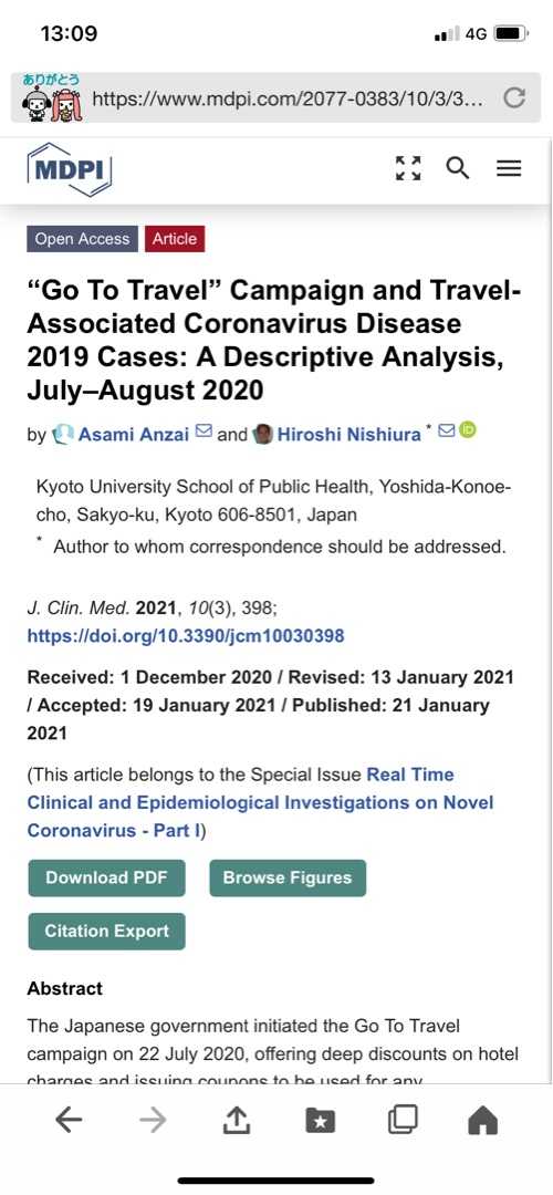前回の日記でアップした、『GOTOトラベル感染増に影響か 京大グループ発表』の記事、京都大学のグループが発表したという「研究論文」を探して読んでみた。その研究論文は・・・Journal of Clinical Medicine"Go To Travel" Campaign and Travel-Associated Coronavirus Disease 2019 Cases: A Descriptive Analysis, July-August 2020AbstractThe Japanese government initiated the Go To Travel campaign on 22 July 2020, offering deep discounts on hotel charges and issuing coupons to be used for any consumption at travel destinations in Japan. In the present study, we aimed to describe the possible epidemiological impact of the tourism campaign on increasing travel-associated cases of coronavirus disease 2019 (COVID-19) in the country. We compared the incidence rates of travel-associated and tourism-related cases prior to and during the campaign. The incidence of travel-associated COVID-19 cases during the tourism campaign was approximately three times greater than the control period 22 June to 21 July 2020 and approximately 1.5 times greater than the control period of 15 to 19 July. The incidence owing to tourism was approximately 8 times and 2–3 times greater than the control periods of 22 June to 21 July and 15 to 19 July, respectively. Although the second epidemic wave in Japan had begun to decline by mid-August, enhanced domestic tourism may have contributed to increasing travel-associated COVID-19 cases during 22 to 26 July, the early stage of the Go To Travel campaign.「Abstract(概要)」だけ抜粋したが、それに「1. Introduction」「2. Methods」「3. Results」「4. Discussion」と続く。ここ数年、医療系の翻訳にも携わってきたが、症状や病名などの専門用語が多く、翻訳準備として用語の下調べ・把握が必要になり、私の専門のIT系よりも難易度が高い。この論文は、日本人なら誰もが知っている「GOTOトラベル」についての研究論文なので、ニュースでよく耳にする用語も登場し、ニュース解説のようなイメージで割とさらっと読めてしまう。「8割おじさん」で知られる西浦教授らしく、詳細なデータの分析結果がグラフで図解されており、素人にもわかりやすい研究論文だ。この論文は、対象期間が2020年7~8月だが、それ以降2020年末まで続いた「GOTOトラベル」と「感染拡大」の因果関係の研究結果が今後発表されることを期待する。個人的には、「GOTOトラベル」が全国で停止された12月28日前後1ヶ月程度の感染状況の分析結果に興味がある。上記、研究論文「Journal of Clinical Medicine」のソースは、こちら