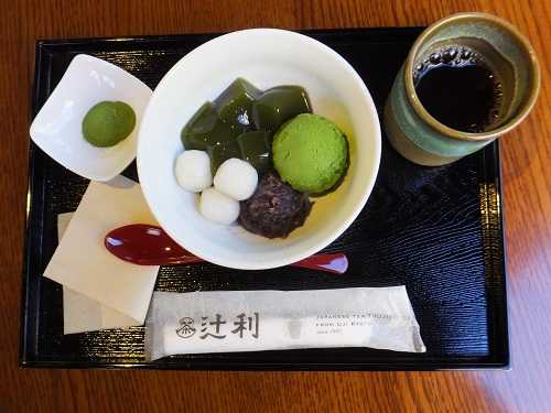 歩き疲れて「平等院表参道」の『辻利 宇治本店』でひと休み。宇治茶や抹茶スイーツを販売する店舗の奥に茶房がある。席は「お好きなところにどうぞ」ということで、奥のお庭にあるテラス席に。店内にも席はあるが、このご時世、密閉されて喚起の悪い空間はできるだけ避けたいので外の席を選んだ。お天気が良くポカポカ陽気だったので、屋外の席でも寒さは感じなかった。メニューを見て、迷わずオーダーしたのは・・・わらびもち(アイス付き) 1,100円(税込)抹茶のわらびもち抹茶のアイスクリーム粒あん白玉追い抹茶(粉末)ほうじ茶抹茶のわらびもちは、見た目も美しく、なめらかでお茶本来の自然なお味で美味だった。アイスクリーム、粒あん、白玉との相性も良い。「さすが辻利さん!」というお味だった。粉末の抹茶は「抹茶のお砂糖」だ。「お好みでかけて召し上がってください」とのことで、少しかけて食べてみたら味に変化が楽しめた。最高のお天気の中で、歩き疲れた身体に優しい抹茶スイーツでエネルギーをチャージできた感じ。宇治を訪れたら、また立ち寄りたい甘味処だ。辻利 京都本店京都府宇治市宇治妙楽156TEL 0744-94-6990営業時間 10:00~18:00茶房 11:00~17:00(LO 16:30)