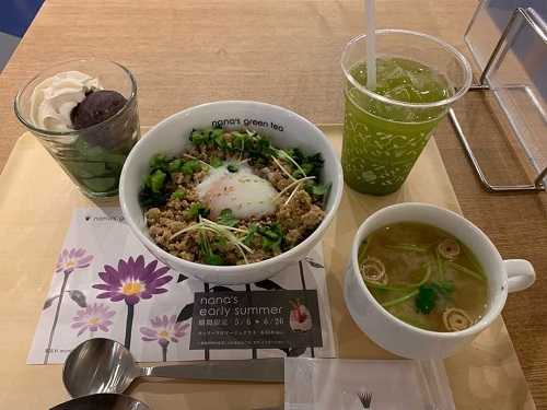 今週もよく働きました~平日しっかり働いた分、週末はたっぷり休みます。お仕事で外出した時のランチnana's geen tea の鶏そぼろどんぶり+抹茶ゼリー+水出し宇治抹茶 1,400円お食事・甘味・ドリンクは、それぞれ自分の好きなものを選ぶことができます。鶏そぼろどんぶりは、温泉卵と野沢菜・かいわれをまぜまぜして食べたら・・・美味し~い元々「鶏そぼろ」が好物なので、お食事は迷わずこちらにしました。甘味は、抹茶ゼリーをチョイス。ゼリーはぷるっぷるっで、しっかり抹茶の味がします。トッピングがアイスクリームではなくホイップクリームで、新しい出会いをした感じ。nana's green teaは、彼のお気に入りで、抹茶のドリンクやデザートは何度かいただいたことがありますが、いつも夜だったためランチメニューがあるとは知らなかったわ~。他にお茶漬けやハヤシライスなどもあるので、また利用したいですランチ後は、英語でのミーティング。日本語から英語にスイッチを切り替えて、クライアントのオフィスに向かいました。