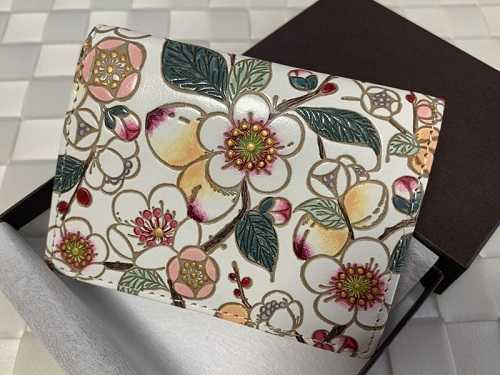 「文庫屋 大関」さんでの文庫革小物のお買いもの。2点目は・・・2月の新柄:梅花(メイホア)(メイホア)は梅花の中国読み。和風な「梅」ではなく、17世紀後半にヨーロッパで流行した中国趣向の美術様式「シノワズリ」をイメージしたもの。春にはみずみずしい葉、夏にはたわわに稔った実、秋にはまた新しい花を咲かせる準備を、そして冬には可愛らしい花を咲かす。春夏秋冬をイメージした柄です。梅花(メイホア) 箱まち小銭入れ 7,040円普段小銭入れはあまり使用しないのですが、コロナ禍で始めた寺社仏閣巡りで、お賽銭や御朱印の初穂料で小銭のみを支払う機会が多くなり、小銭をスムースに取り出すために購入しました。背面は、ベージュ系の型押しで、傷や汚れがつきにくいです。カードポケット付きですので、Suica・PASMOなどの交通系カードやよく使用するカードを入れることができます。厚みは15ミリほど。小銭入れとしてはすっきりサイズです。「箱まち」という名の通り、小銭入れ部分は箱状になっています。このような形状の小銭入れは、文庫屋大関さんの「箱まち口金付き札入れ(二つ折り財布)」で初めて使用しました。小銭が見やすくて取り出しやすく、お気に入りです。ポケットが付いているので、お札やカードをはさんでおくこともできます。箱まち小銭入れは、小銭だけでなくお札やカードも収納できて、ちょっとそこまでお買物に行く時などにお財布としても使用できて便利です。また、アクセサリーや薬入れとしても。これほど汎用性の高い小銭入れはなかなかないと思います。梅は早春の花ですが、柄の説明にもあるように春夏秋冬が感じられるデザインで、「シノワズリ」という言葉がピッタリです。様々なデザインの梅の花、鮮やかな葉のグリーン・・・落ち着きがありオリエンタルな雰囲気で本当に素敵です。年齢を問わず、和装にも洋装にも合う柄だと思います。時々着る和服の時にも持ちたいと思います。文庫屋大関https://www.oozeki-shop.com/