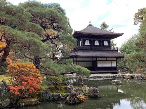 洛北で、蓮華寺、詩仙堂、八大神社、圓光寺と巡り、バスで白川通を南下して次の目的地へ向かう。久しぶりに、銀閣寺にやってきた。銀閣寺は、文明14年(1482)、室町幕府8代将軍の足利義政が、足利義満の北山殿(金閣寺)にならい、隠居の地として造営した山荘「東山殿」が始まり。着工から完成まで約8年の歳月を要し、義政は観音殿の完成を待たずして逝去。義政の遺言により、臨済宗相国寺派の寺院となった。「わび・さび」の美意識を重んじた東山文化が色濃く感じられる建築物である。総門への参道総門をくぐり右に曲がると、生垣が続いている。その先にある中門をくぐると参拝受付がある。拝観料を納め、御朱印をいただいて進むと、樹齢500年といわれる「五葉の松」が目に入る。他の方は右に見える紅葉をバックに写真を撮っていたが、私は左の立派な「五葉の松」に目が釘付けになった。観音殿(銀閣) 【国宝】二層からなり、下層の心空殿は書院造、上層の潮音閣は板壁に花頭窓をしつらえて桟唐戸を儲けた唐様仏殿の様式。創建時の二層の外壁は黒漆におおわれ、軒下には彩色が施されていたそう。内部は、通常非公開である。銀沙灘・向月台白川砂を敷き等間隔にストライプを描いた銀沙灘とその脇に建つ盛り砂の向月台。向月台は、富士山を思わせる高さ1.75mの円錐型の盛り砂。本堂東求堂 【国宝】義政公の持仏堂。一層の入母屋造り、桧皮葺きの現存する最古の四畳半書院。観音殿と並んで造営当時から残る建物で、阿弥陀如来像を安置している。TOPの写真もそうだが、錦鏡池の向こう側から見る観音殿は、何とも風情があり、名残りの紅葉が彩りを添えている。観音殿の屋根の上には鳳凰が。お天気も良いことだし、せっかくなので展望台に上ってみましょう。展望台にたどり着くまでには、いくつか見どころがあり、各所で足を止めて案内板を読んだり、写真を撮ったり、眼下の美しい景色を眺めたりで、なかなか先に進まない。お父さんと娘さんの二人連れと一緒になり、お父さんが「オレ、もう来られないかもしれないから、展望台まで上るわ」と足を引きずりながらゆっくり坂を上っていらしたのが印象に残っている。洗月泉「花いかだ」ならぬ「紅葉いかだ」お茶の井茶の湯を愛した義政が茶道に使ったという水が涌く。西芳寺の瀧淵水の石組と同じ構造をしているそう。冬の低い日差しを浴びて、紅葉が輝いていた息を切らしてたどり着いた、展望台からの眺め京都市内を一望できて、絶景だわ~少々疲れたが「上ってよかった」と思った。あの親子のお父さんも、この景色に満足されたことでしょう。年齢にかかわらず、人間、誰しも明日どうなるかわからないから、今やりたいこと・今できることはやっておいた方がいい。新型コロナウイルスという想定外の疫病流行に見舞われた今・・・つくづくそう思う。展望台から見える観音殿も美しかった。御朱印は書き置きだった。この時期、どの寺社仏閣も閑散としていたが、銀閣寺は参拝客がそこそこ多く、修学旅行の団体も見かけた。写真を撮る時だけ「マスクを外してくださーい」と引率の先生?が声をかけていた。こういうご時世の修学旅行は、感染リスクと背中合わせで気を使って大変だろうが、一生に一度のことだから思い出に残る旅になってほしいと願った。銀閣寺の門前にはたくさんの飲食店や土産店が軒を連ねているが、半分くらいはクローズしていた。以前母と一緒にランチをした老舗のお食事処も閉まっていて、なんだか寂しくなった。銀閣寺【慈照寺】京都府京都市左京区銀閣寺町2拝観時間 8:30~17:00(12~2月 9:00~16:30)拝観料 500円アクセス 市バス「銀閣寺道」下車 徒歩10分