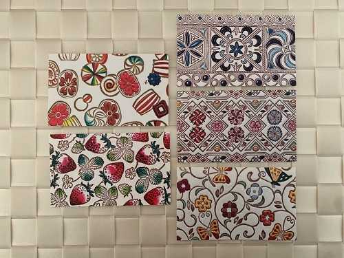 右の3枚は、浅草店。同じく上から「錦紗<青>」「花菱」「金唐大花」。