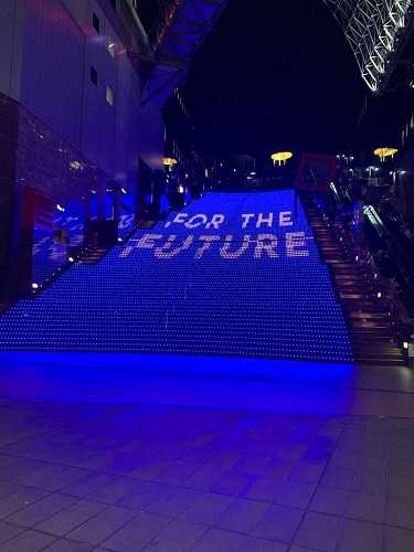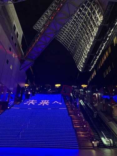 上の写真の反対側には大階段があり、一定時間ごとにカラーと文字が変わる。