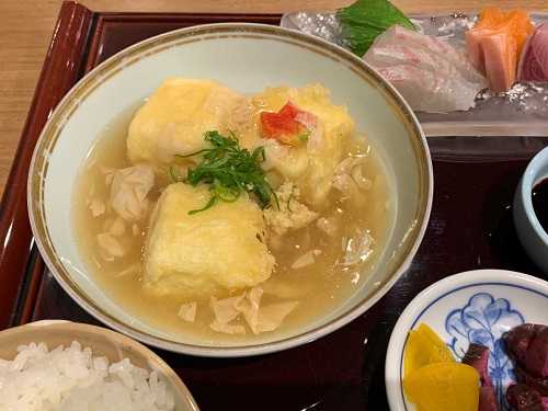 定食は、揚げ出し豆富、造り三種盛、ご飯、吸物、香の物