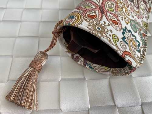 内装のブラウンとタッセルのベージュが、柄とバランスよく調和している点にも感心です。