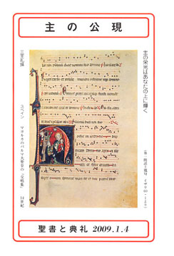 主の栄光はあなたの上に輝く(第1朗読主題句 イザヤ60・1より)三王礼拝 スペイン マヨルカのパルマの大聖堂の『交唱集』 14世紀中世スペイン、カタルーニャ絵画の様式が反映している『交唱集』(アンティフォナーレ)。アンティフォナーレとは、「聖務日課(教会の祈り)」の聖歌集のこと。このページは公現の秘義を内容としている。具体的にどのような歌詞か文字は判読しにくいが、この三王礼拝図は、下から4段め冒頭「きょう」(hodie) の頭文字hを装飾してその中に描かれている。福音書(マタイ2・1)で「占星術の学者たち」(マギ)といわれている人々が、中世では3人の王として描かれることは、すでに多くの例から見ているとおりである。宗教画では三王礼拝という画題で知られるようになっている。 ここでも王冠をつけ、1人が黒人で異民族のそれぞれの王を現していること、3人それぞれが贈り物を抱えていること、彼らを導いた星が非常に強調されていること、5人の人物像の中心にひざまずいて贈り物を献げる王がいることなどが、この出来事の中心を指し示している。鮮やかな赤が主の栄光を表すために使われているところも興味深い。カタルーニャ絵画独特の色彩感覚なのかもしれない。非常に細かくて見にくいが、マリアは左手で幼子を抱え、右手で幼子を指し示し、幼子の右手は祝福のしぐさで、左手は巻物を抱えていると思われる(下図、絵部分のみ拡大)。この形式が前回の1月1日「神の母聖なるマリア」の表紙でみた「ホディギトリア型」の聖母子像と同じであることは興味深い。聖母子を描く普遍的な型の一つだったのだろう。(『聖書と典礼』編集長 石井祥裕)マンガ聖書物語(旧約篇)