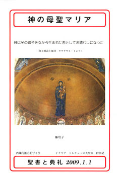 神はその御子を女から生まれた者としてお遣わしになった(第2朗読主題句 ガラテヤ4・4より)聖母子 内陣円蓋のモザイク イタリア トルチェッロ大聖堂 12世紀トルチェッロはヴェネツィアのラグーナ・ヴェネス(潟)にある小島(下図)。7世紀に司教座が置かれ、サンタ・マリア・アッスンタ大聖堂(トルチェッロ大聖堂)が建設された。9世紀から11世紀にかけて改築されている。そこの12世紀から13世紀にかけて作られたモザイク壁画はヴェネツィア近辺一帯で活躍したビザンティンのモザイク職人の手になるもので、様式的にはヴェネツィアのサン・マルコ大聖堂のモザイクとも似る。この聖母子像は、マリアが左手に幼子を抱えている、ビザンティン美術の聖母子像のなかでは「ホディギトリア」という型のもの(下図:アトス山ヒランダリ修道院のモザイク参照)。「ホデゴン(「道を示す方」の意)修道院にあった聖母子像」というところからこの名で呼ばれる。ホディギトリアのマリアは玉座に座っているものと起立しているものがあるが、これは起立している。マリアの右手は、左手に抱く幼子イエスを恭しく示している。幼子は身を左に傾けながら、右手は祝福のしぐさ、左手は巻物(神の言葉のシンボル)を抱える。幼子でありつつ、やはり「主」である。主としての威光に満ちたその姿から溢れ出てくる神の栄光の輝きが空間全体を満たしているのである。静寂に包まれた光という神秘感が巧みに表されている。下には部分しか見えないが、パウロも含む使徒たちが描かれている。マリアの足の下、中央の(向かって)左がペトロ、右がパウロ。ミサの奉献文で(各奉献文ごと文言はそれぞれ多少異なるが共通して)神の母おとめマリアとすべての使徒たちを思い起こして、彼らとともにわたしたちが永遠のいのちにあずかることのできるよう祈る。その祈りの心に響き合う図といえよう。ちなみに、マリアの上にあるモノグラム(組み合わせ文字)は「マリア・神の」を示すもので、「神の母マリア、聖なるテオトコス(神を生んだ方)」というマリアの尊称の略号で、ビザンティンイコンで使われたもの。(『聖書と典礼』編集長 石井祥裕)カトリック平野教会 神の母聖マリア ご説教マンガ聖書物語(新約篇)