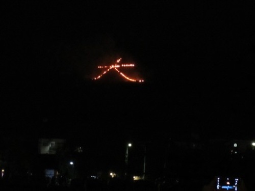 昨日の関西、昼間はすごい大雨でした。 京都市内も、 鴨川の水嵩が増したり、市内のあちこちで下水だか水道管だかが溢れたりしたようですが 「8月16日は、なにがなんでも五山送り火!」という京都人に意地をみました!(゜Д゜;)ぅおお! 夕方になって、中止という気配が全くないので私&ダンナサマも予定通り京都にGO! JR京都駅から地下鉄に乗り、今出川まで行ってそこから徒歩で出町柳を目指します。川の水が増水してるので、川沿いの遊歩道や三角州は立ち入り禁止になってたので 橋の周辺が大混雑〜!(@Д@;) 賀茂大橋の北側、妙音弁財天のあたりで見ましたよ〜! 一番定番?の「大」の字。 観終わって、駅に向かう途中、橋を渡りきったところでちらっと・・「船」の端っこが観えました。私は15年ぶり?くらいだったんだけどやっぱり五山送り火はいいなあ~。まだまだ残暑厳しいけど夏の終わりを感じます。といいながら(笑)あまりの蒸し暑さ&混雑疲れで大阪に戻ったとたん、フローズンビールに飛びつくダンナサマでした~(^ロ^;)あははは
