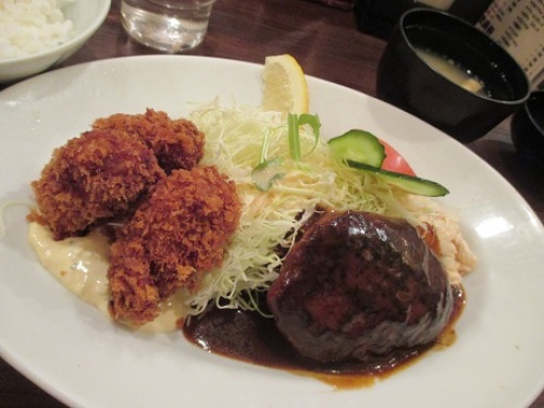 とある休日、ダンナサマと・・・・・駅前ビルの「グリル欧風軒」で夜ごはん。 http://tabelog.com/osaka/A2701/A270101/27019947/ 牡蠣フライ&ハンバーグというなかなかガッツリな組み合わせを選ぶ私。 こちらのハンバーグは、ふんわり系じゃなくて肉肉しい系! これはこれで美味しかった〜!!!! ちなみに平日の夜だったんですが男性も女性も、おひとりさま客が多かったです♪ダンナサマも、お昼によくひとりで利用してるらしい