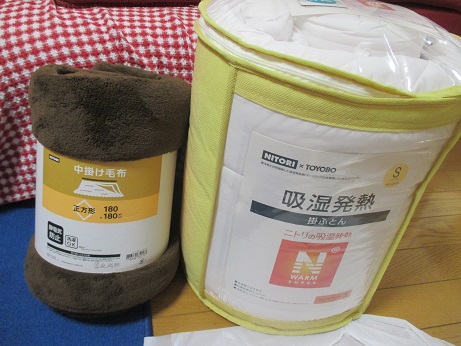 数日前まで、まだ真夏だったのに・・・ 朝いきなり!秋が来たー!(゜Д゜*) 寒っ!!!!!! というわけで、この春まで使ってて ペチャンコになってた私の羽毛かけ布団。 先日、もう絶対に買い替えてやる!という意志で捨てたので ニトリに行ってきましたよー! 化学繊維100%だけど ニトリの掛け布団シリーズの”あたたかいレベル”1~5の中で MAXの「5」っていう表示に・・・期待を込めて Nウォームの掛け布団ー!!!!(*´▽`*) 戸建の冬は、寒いからね!(笑) ついでに、コタツの”中掛け毛布”っていうのも買ってみたー!ぬくぬくの予感! パジャマも、半袖&半ズボンを片づけて 長袖&長ズボンに衣替え~♪ さあ!秋よ来い!!!! 願わくば・・・・暖冬!来い!!!! 買った翌日、太陽で半日干してさっそく夜つかったんだけど・・・軽い!温かい!!!お手入れ簡単&低価格っていうことを考えたらこれは羽根布団を越えたかもしれない!?どっちも楽天市場にもあったわ・・・わざわざ店舗いかなくてよかったんだね(´▽`;あはははははは~吸湿発熱わた掛ふとん シングル(NウォームSP 16 S) ニトリ 【送料無料・玄関先迄納品】こたつ中掛け毛布 レスト(正方形) ニトリ 【送料有料・玄関先迄納品】