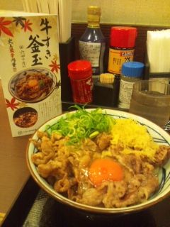 丸亀製麺、だーいすき!!!!夏は、冷やしぶっかけ+鶏天&野菜天寒くなると、かけうどん+かき揚げ天・・・が定番なんですが最近、新メニュー?限定メニュー?でちょっと高めのやつが出てて気になってたのよね~・・・・というわけで食べた~!牛すき釜玉~!天かすと、おろしショウガをたっぷりお肉も、注文してから焼いてくれるからふわふわあつあつ!!!美味しい~!!!!ただ・・・生卵より、温泉たまごのほうが良かったなあー。言ったら変更してもらえたのかな?????