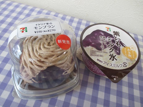 紫いもミルク氷!発売日前日になぜか売ってたので迷わずGETしました!ミルク氷シリーズ、今年は全部制覇したけどどれもこれもハズレなしだわー!美味しい!!!芋ペーストのねっとり感!まさに秋スイーツ!!!夏にはちょっと重すぎるけど、秋に嬉しいねっとり感!!!モンブランも・・・もちろん美味!このお値段だから、もちろん・・渋皮煮がゴロン!とは入ってないけどその代りに渋皮煮風?のペーストが中にちょんと入ってました!嬉しい!はあ~!コンビニスイーツ好きすぎてダイエットできない