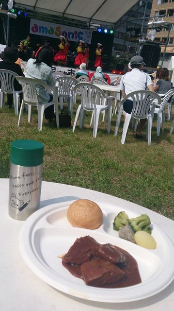 この土日、阪神尼崎駅前で尼ソニックという音楽イベント開催中です♪http://amasonic.jp/よく行く洋食屋さん「のらくろ」も出店してたのでタンシチュープレート(1000円)をいただきました。ハワイアンを聴きながら、まったり秋の休日♪もともと美味しいお店なんだけどお外で食べると美味しさ倍増!!!!そして・・・おなかちょっと足りなくて私が小学生の頃から大好きなクレープ屋さん「ロリアン」によく考えたら・・・何年やってるんだろう?少なくとも30年以上!?もう老舗だね!!!生クリームラムレーズン@300円素敵な下町価格!イイネ~!というわけで、けっきょく・・・食欲の秋!(笑)