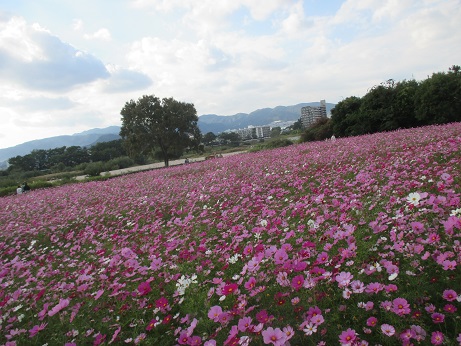 尼崎、武庫川の河川敷にあるコスモス園に行ってきました。数年ぶりに行ったんですが・・・びっくり!以前より大幅に規模拡張してましたーしかも駐車場代300円だけで、入場料はタダ!亀岡コスモス園みたいな出店はないけど、とにかく広くてキレイ!とにかく広くて、犬を散歩させてる人や、お弁当をひろげてピクニックしてる人いろいろでした~☆ちなみに私が行ったのは、2日前。まだまだ見頃ですよ~