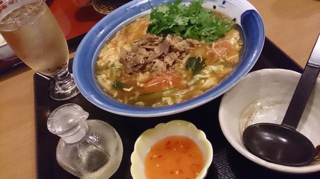 「うどんの民芸」に行ったら夏メニューに変わっててhttp://www.ajino-mingei.co.jp/brand/その中に・・・!牛肉とパクチーの黒酢酸喇うどん!迷わず注文するよねー!?プラス料金でパクチーを増量することもできるんだけどパランス的には、標準の量でちょうどいい感じ♪添えてあるスイートチリソースを加えたらますますアジアっぽくなって美味しかった~!!!定番化してほしいな