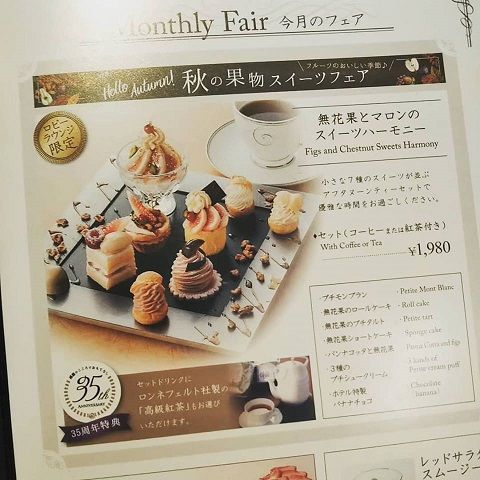 平日にお休みができたので、ひとりでぷらっと梅田に。雑踏から逃れたかったので、お昼ごはんは静かなホテルグランヴィア大阪1階のそのまた奥の方にあるロビーラウンジにGO♪ ホテルグランヴィア大阪 よしよし!ビジネス使いしてる人が多くてそこそこ席は埋まってるけど予想通り静かで落ち着いた雰囲気だわあ。「無花果とマロンのスイーツハーモニー」(1980円/税サ込) https://www.granvia-osaka.jp/restaurant/ll/0310/000324 ごはん・・っていいながら、完全にデザートだけど(笑) 今日は自分へのご褒美だからイイねん♪イイねん♪飲み物は、ドリンクメニューから好きなのを選べるんだけど 普通の紅茶(1000円)でも、ロンネフェルトの紅茶(1300円)でも どっちでも選んでいいよ・・って言われたら、当然後者を選ぶよね? というわけでロンネフェルト社のアールグレイをいただきました(´ω`*)んふっ プチサイズのケーキが、いろいろもりもり。 1980円で、単品なら1300円の紅茶を選んだから このスイーツプレートは680円!?Σ(゜Д゜*) ホテルグランヴィア!太っ腹すぎるわ!!! テーブルの間隔も広めだし、のんびりゆったりできて Free Wi-fiもあるし・・・ついつい長居しちゃった♪ 予約もできるし、意外と休日の激混みな梅田でも穴場的な休憩スポットなのかも~♪