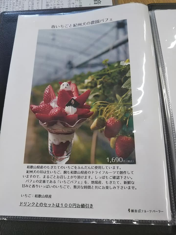 河内長野のランチバイキングを堪能した後はいざ!和歌山に! ランチバイキングであれだけ食べたけどね・・・ 向かったのは・・・ここ。 「観音山フルーツガーデン」 https://www.kannonyama.com/ 去年の秋に母を連れていったときは激混みだったけど 今回は・・・混んでたけど待ちなしで入れたよー!!! ダンナサマも友達も・・・食べたのは!これ! 「春いちごと紀州犬の農園パフェ」 来たよー来たきたー! 3つ並べると更に可愛い!! 紀州犬ーん!!!! スプーンで持ち上げたら生首状態Σ(゜Д゜*) たっぷり苺、練乳味のソフトクリームとたっぷりポイップ。 ほんのちょっぴりスポンジケーキ もうね!美味しすぎたよね! 私とCさんがふんふん興奮して食べてるのを ダンナサマがそれはそれは楽しそうにいろんな角度から撮ってました カフェは2階で1階は果物倉庫になってるんだけど そこでかんきつ類の試食&量り売りをしてたから はるかと、デコポンを2個ずつ買って、はるみ2個をおまけで貰いましたよ。 食欲を散々暴走させた後は ようやく今日のメインイベント根来寺のお花見に・・・Cさんは満足しすぎて、すっかりメインイベントを忘れてたわ(笑) 根来寺の桜は、数日前の日記をさかのぼってみてね♪観音山フルーツガーデン、楽天市場にも出店してます。はるか、めちゃめちゃ美味しいからすっきり系かんきつが好きな人にはオススメですよー!!観音山フルーツガーデン楽天市場店観音山はるかA級品遥か 5kg