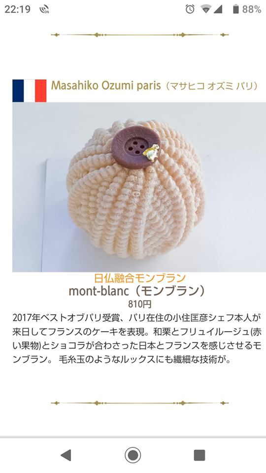 初日に行って、食べたパフェが写真と実物の違いにへこみまくって不完全燃焼だった、阪急ケーキショー。美味しかったんだけどね・・・でも、なんか不完全燃焼だったんだよね。というわけで、2回目!(笑)平日の12時前瞬殺だと思ってたミスターチーズケーキやケンズカフェもまだ残ってて・・・どうした!?阪急百貨店!でも・・そんな中私のお目当てだった「マサヒコオズミ パリ」の毛糸玉みたいなモンブランは完売でした(><。)時間はわかんないけど今日まだ入荷しますって言われたけど待ってまで・・・と思ってそして、モンブラン以外は全部残っててよーくみてみたらモンブランより美味しそう!ということでモンブランの再入荷を待たず購入決定!いちご系と珈琲系どっちも値段は高いけどああ、めちゃ手間暇かかってるわーってわかるやつ!若いシェフだけど、素晴らしいセンス!美味しかった~!!!!今年の阪急ケーキショー&時をかけるあん私はこれにて終了です!なんか思ってたより盛り上がってなかったけど来年もどうかどうか開催されますよーーーーーーーーに!