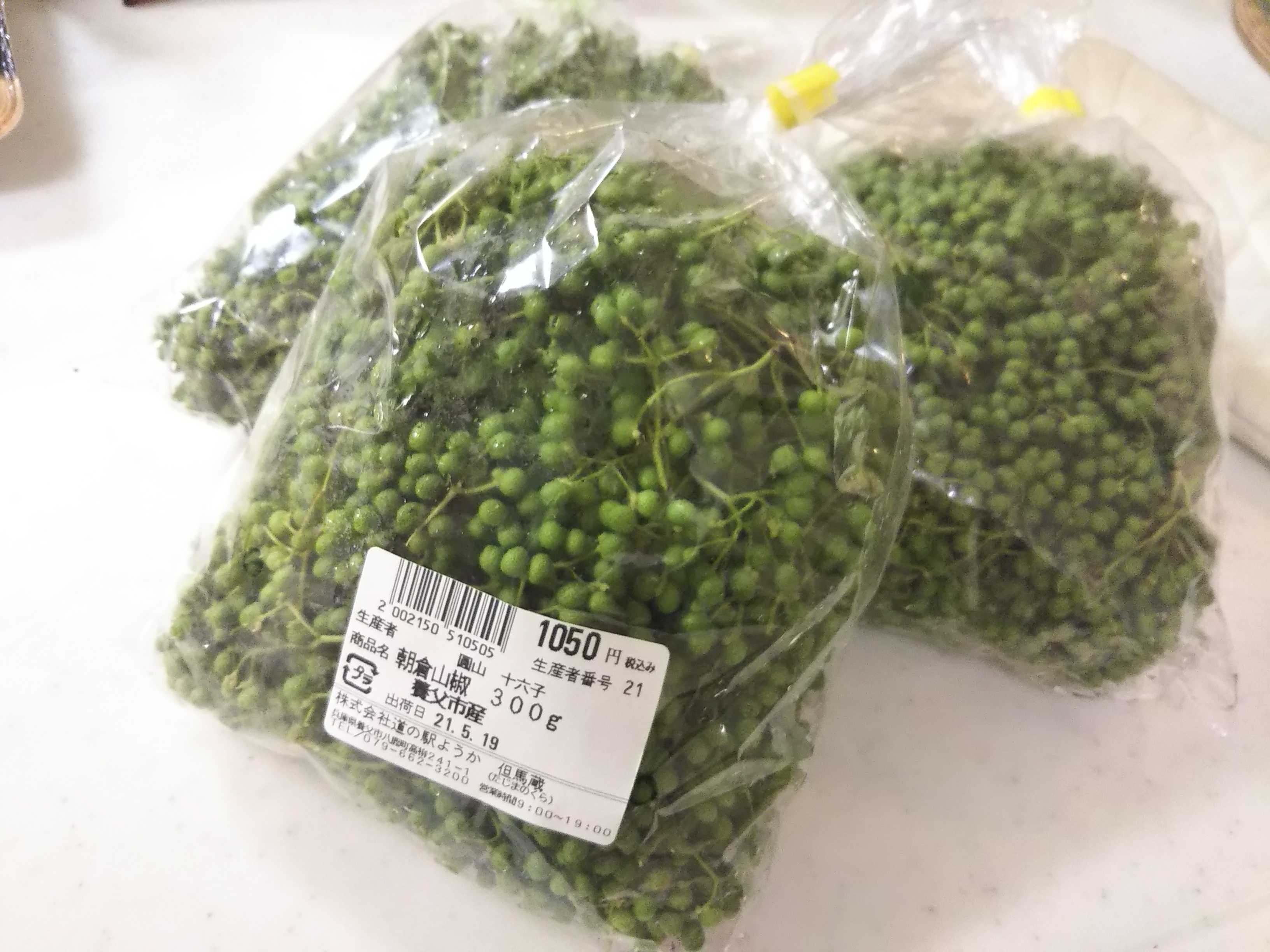 まだまだ緊急事態宣言中ですが私の大好きな実山椒。その中でも、圧倒的に美味しいのが養父市八鹿にある朝倉山椒!「道の駅ようか但馬蔵」で買えるんですが4月末からの緊急事態宣言でずっと休業だったんですよね。今年は山椒、買えるかなあ・・って心配してたら5月12日から平日だけ営業再開!というお知らせを受けて行ってきましたー!!!!!だいたい100gで350円くらいが相場のようです。我が家用に300g、実家の母には600g。家に帰ってからハサミでチョキチョキ・・・小枝を切り落とすのに300gで2時間以上かかりここからさらに3分塩ゆでして一晩水にさらして水を切ったら、新聞紙の上に広げてしっかり水気を取ったら冷凍庫にIN!!!!醤油漬けにしたり、佃煮に入れたり、とにかく我が家にとって、必須スパイスなんですよー(*´艸`*)収穫量がそれほど多くないので産地以外で売ってるの見たことないですがとにかく山椒好きなら、ぜひ一度食べてほしい朝倉山椒!!!生の実山椒が買えるのは今だけ・・ですが乾燥の粉末山椒や、佃煮なら1年中買えるのでほんと、ぜひ!おすすめです!!!!兵庫県養父市産 朝倉山椒の実(冷凍) 500g×2袋あく抜き・枝取り処理済みです。送料無料 クール冷凍便にて配送沖縄.離島は別途送料ピリリとした辛味と爽やかな柑橘系の風味のプレミム山椒です。私が大好きなケーキ屋「カタシマ」が製造してるこれもおすすめ!【ふるさと納税】朝倉山椒のタプナード3本セット