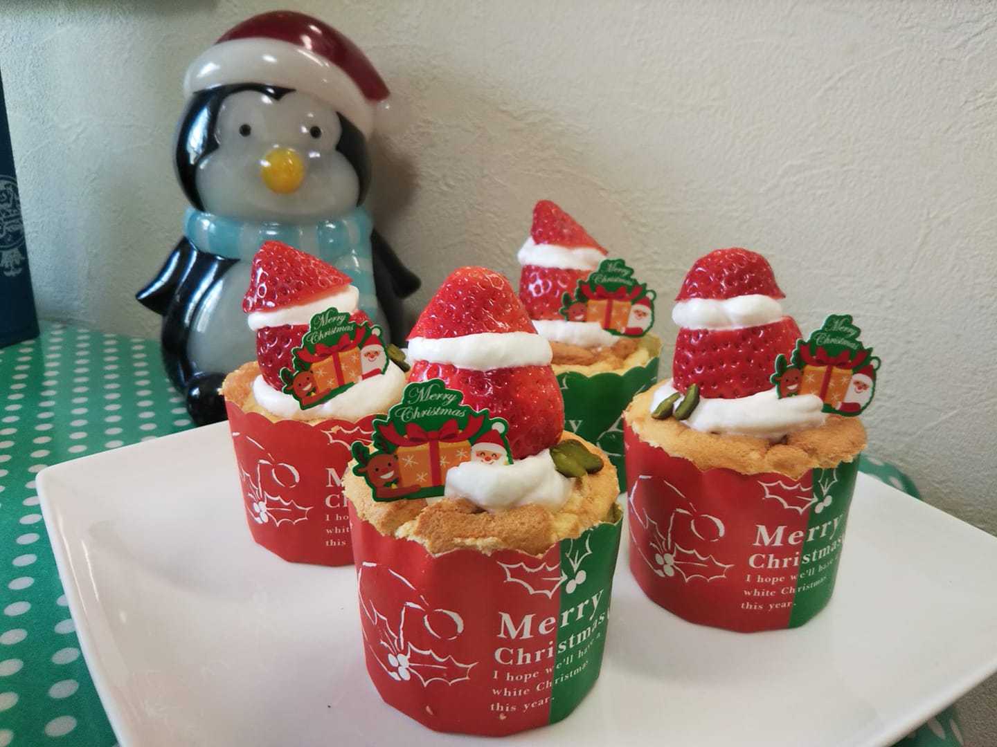 繁忙期を終え帰宅した24日・・・クリスマスケーキ、焼くの????この日は仕事帰りにAfternoonteaTearoomでツリーケーキ食べたし私のなかではもうクリスマスケーキなくていいな、だったけど近くに住む両親はワクワク楽しみにしてたぽいので簡単にできるもの、つくりました24日の夜遅くにシフォンケーキを焼いて25日の朝にクリームを絞って飾って両親に持って行きましたよー。めちゃめちゃ簡単でシンプルなケーキだけどクリスマス柄のカップと、サンタさんピックのおかげでそれっぽく仕上がっております(笑)------------<材料> マフィンカップ4個分・卵黄 2個・グラニュー糖 15g・サラダ油 10g・牛乳 20g・バニラエッセンス ひとふり☆薄力粉 30g☆BP 0.7g●卵白 2個●グラニュー糖 30g◇生クリーム150ml◇グラニュー糖 10g------ 卵黄と砂糖を軽く湯煎にあて人肌くらいの温度にしてバニラエッセンスまで、ホイッパーですりまぜる☆をふるってそのままホイッパーで混ぜ入れる●をしっかりツノがたつまでハンドミキサーで混ぜてまず1/3を生地に混ぜ、残りもさっくり混ぜる絞り袋に入れて、マフィンカップの9分目くらいまで流しいれる。170度のオーブンで18分焼く冷めたら、真ん中に、絞り金口の逆側で穴を開けホイップした生クリームを絞り入れる(穴の大きさ&深さで、好みのクリームの量に調節してください)冷蔵庫でしっかり冷やして完成!とにかく簡単!めっちゃ簡単!バターを使わないケーキ、っていうだけで「室温に戻す」って作業がないからラクチンって感じちゃう!しかもマフィンカップで焼いてるから持って行くのもラクチン。クリスマス以外でも、これ・・けっこう応用できるかも!オススメでーす♪