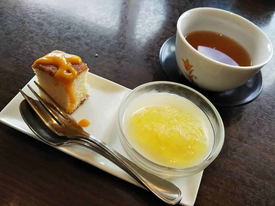 食後は、杏仁豆腐にレモンピューレが乗ったやつと、カステラにマンゴーソース。