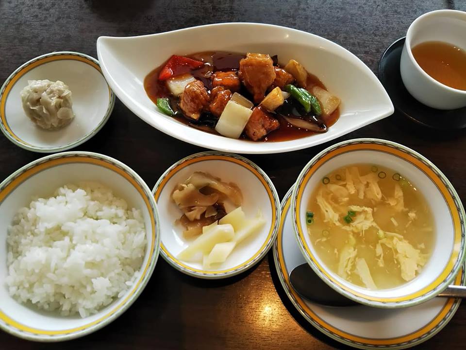 黒酢の酢豚+シュウマイ+冬瓜入りたまごスープ+搾菜