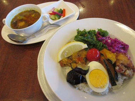 サバのドライカレーに、スープカレーと野菜ピクルスが付いた