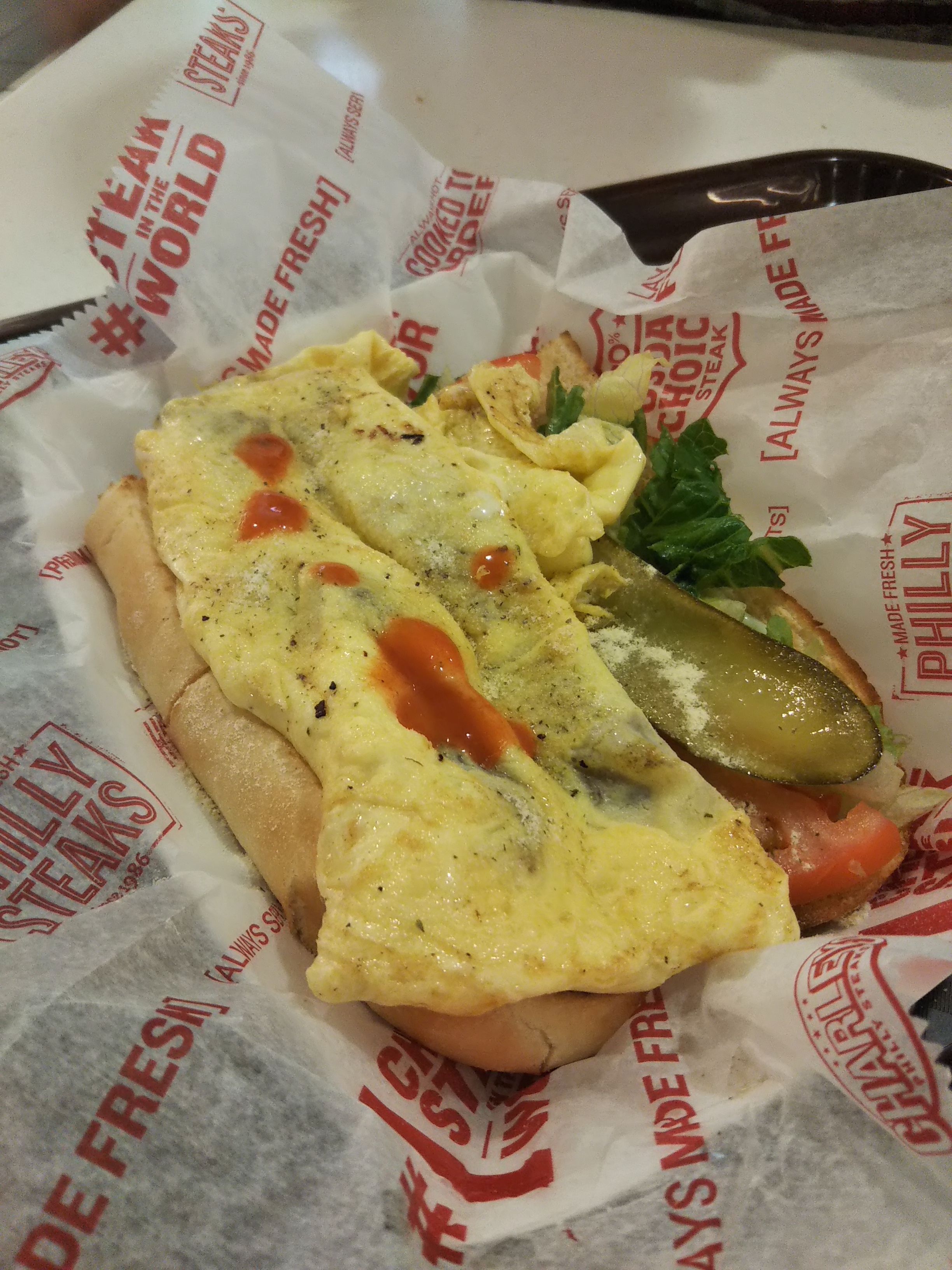 熱々のオムレツとピクルスがシンプルなパンにはさんであって