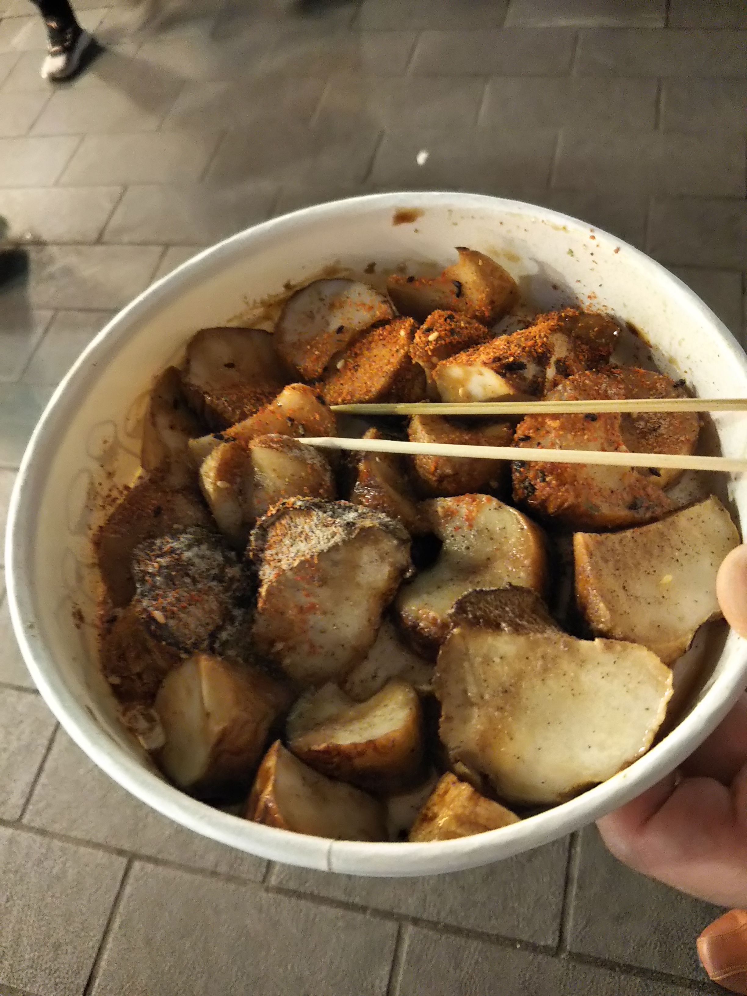 日本のお祭りの屋台みたいな感じで、椅子とかもないので食べ歩きです。