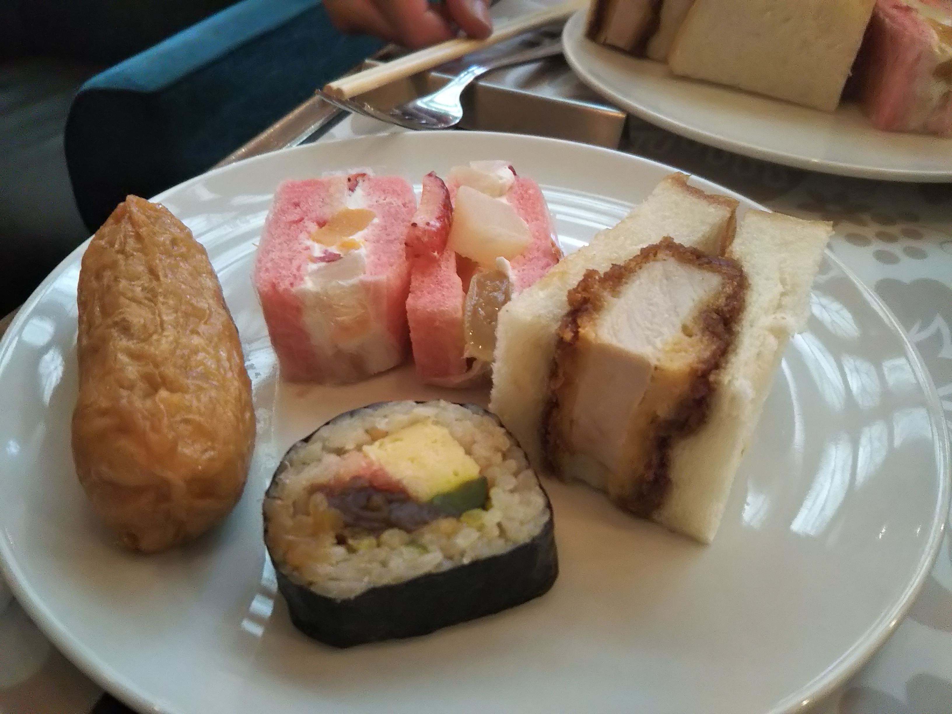 稲荷寿司、巻き寿司、カツサンド、フルーツサンド