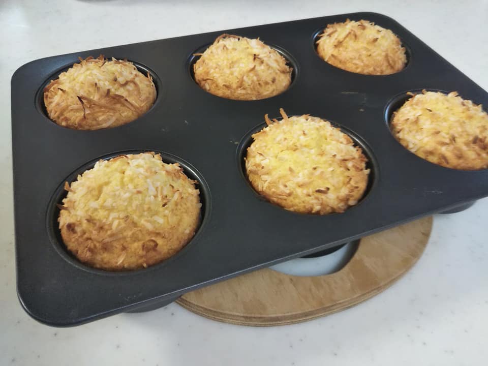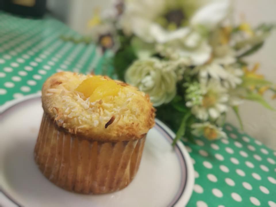 ココナッツファインをかけたうえに、パイン2切れを乗せて焼き上げます
