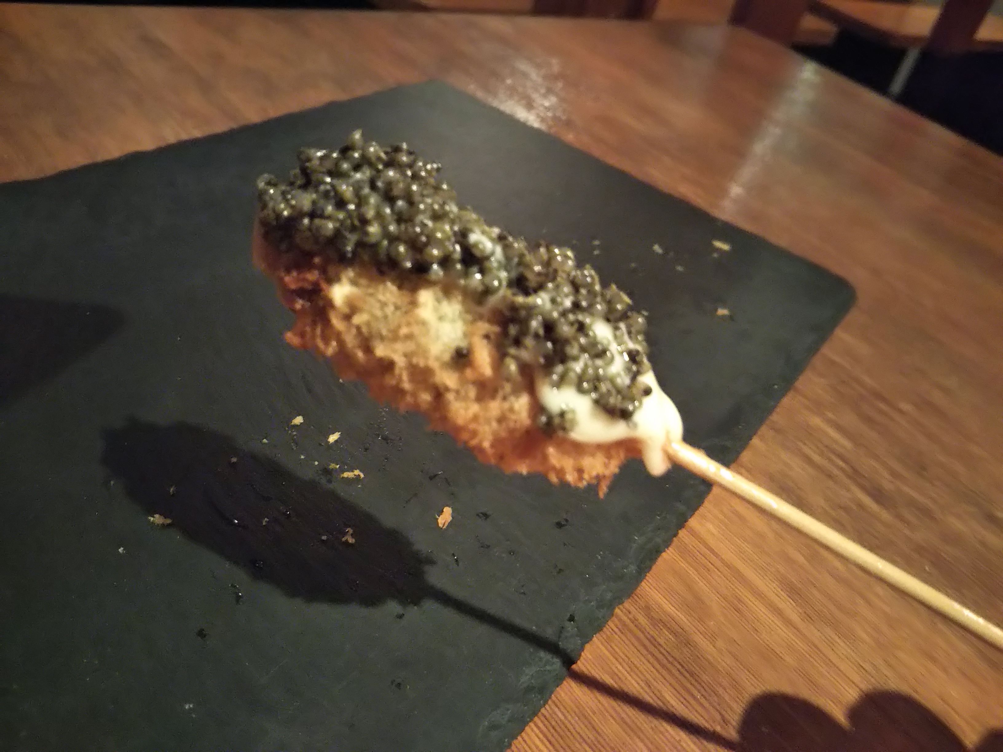 燻製の煙の中から、クラッカーに乗ったサーモン揚げが登場!