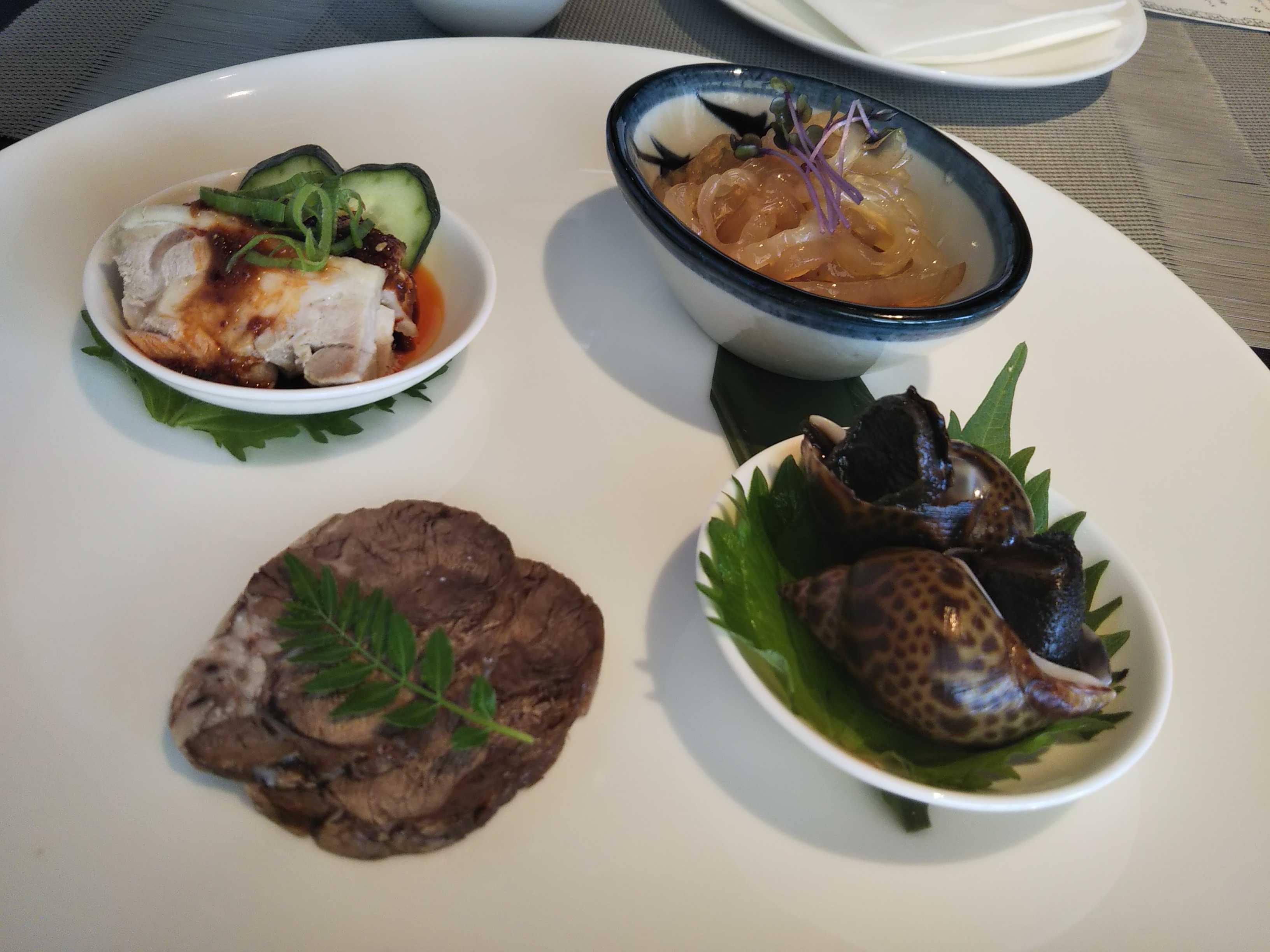 (口水鶏・クラゲ冷製・牛肉の中華醤油煮・舞鶴産 黒バイ貝の中華醤油煮)