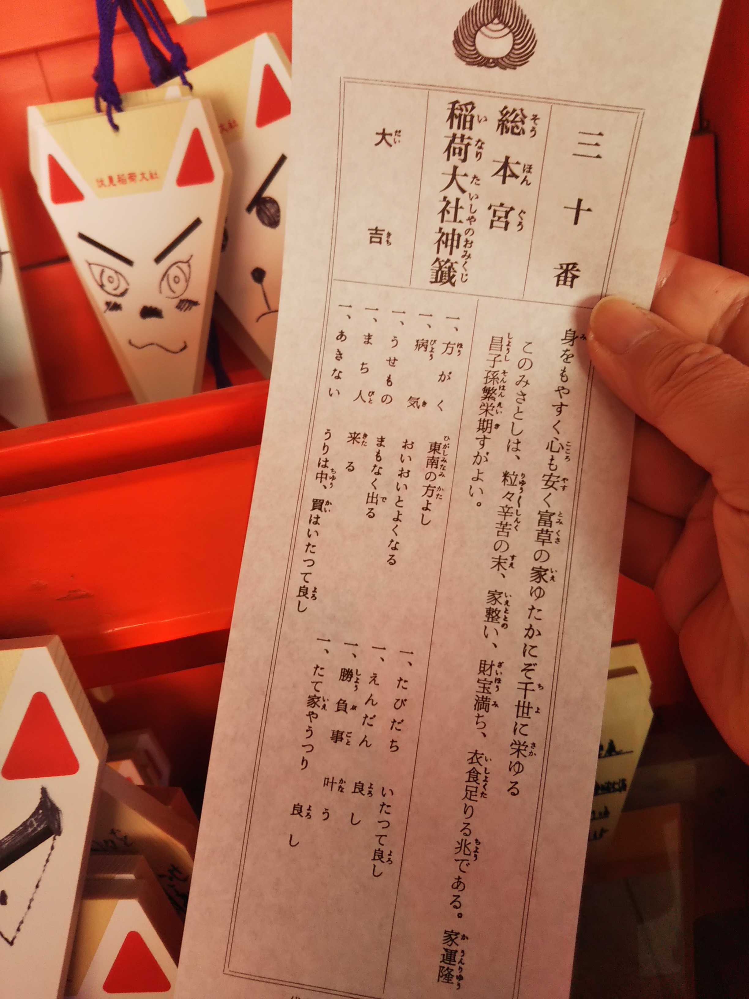 私が好きな、きつね絵馬や、おもかる石のあるエリア・・・の、おみくじを。