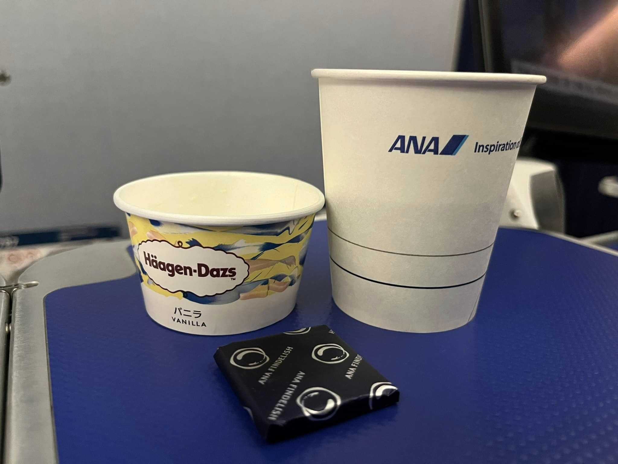 到着前には、おつまみスナック&マフィンが巾着に入れて配られて