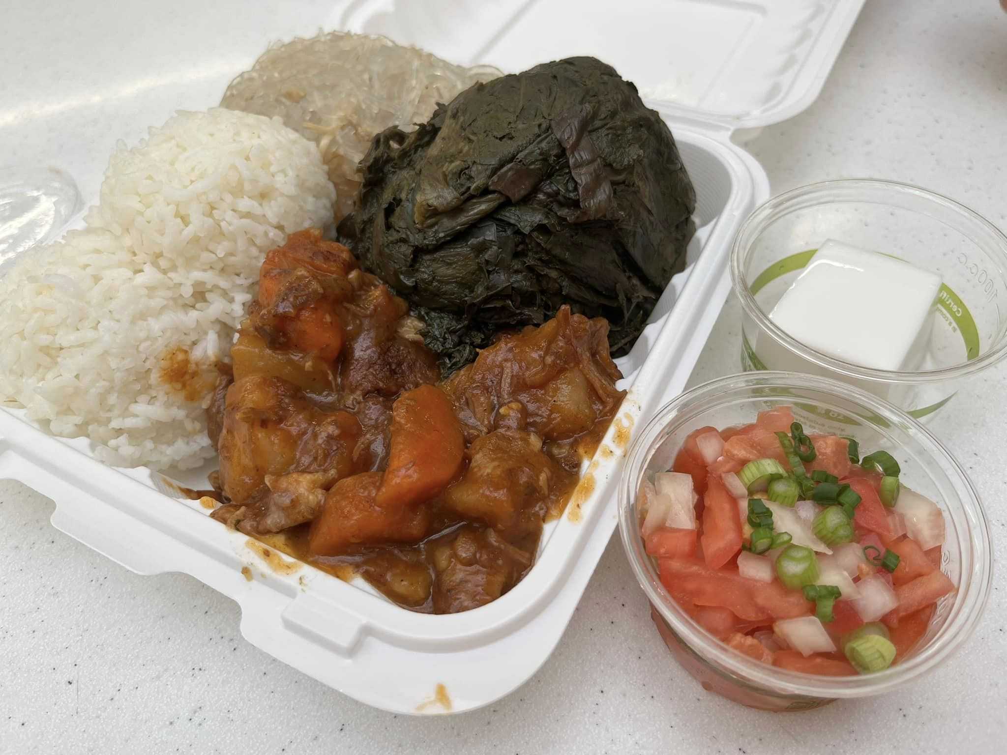 ビーフシチュー、ライス、トマトマリネ、ココナッツミルクゼリー。