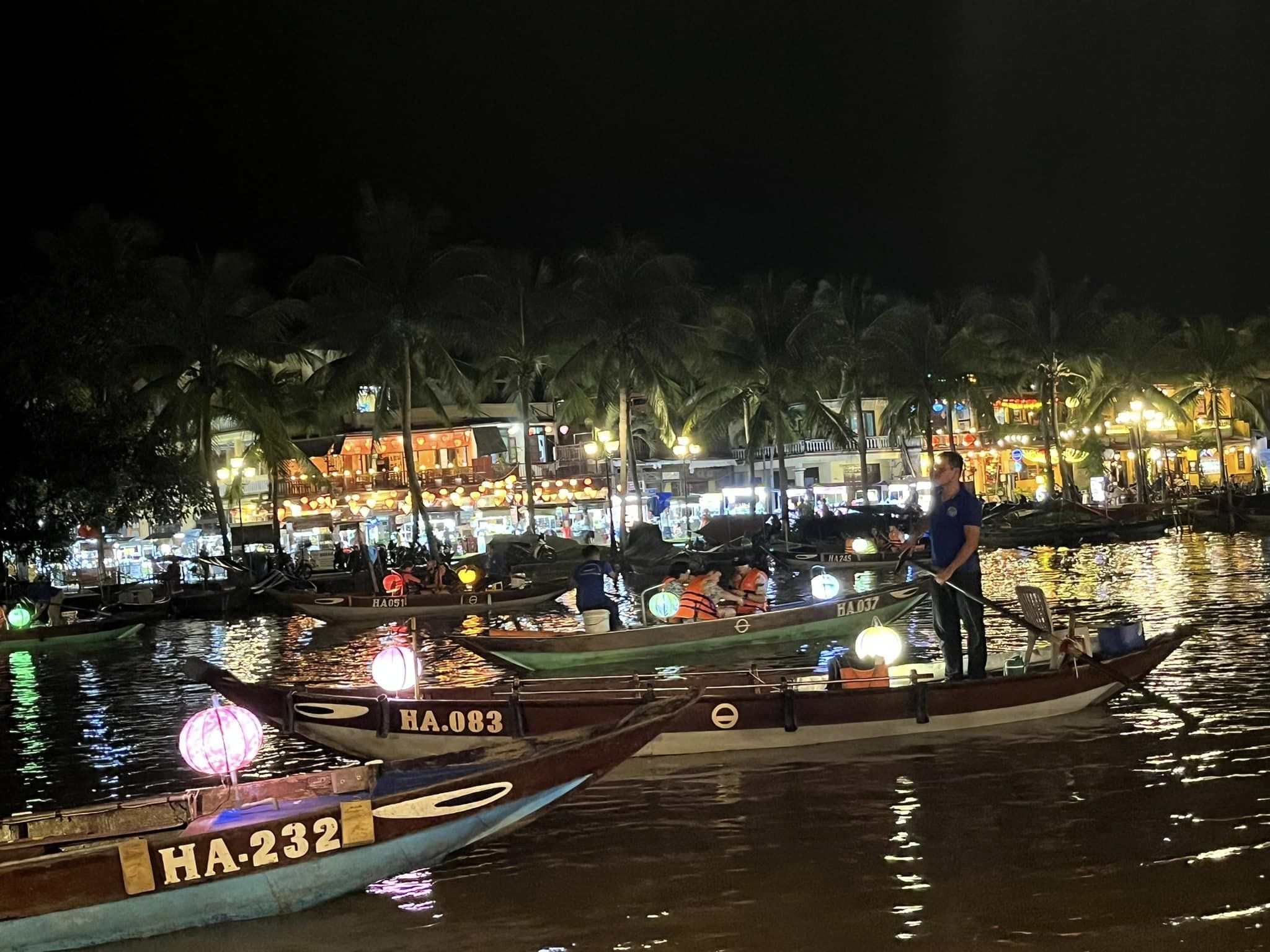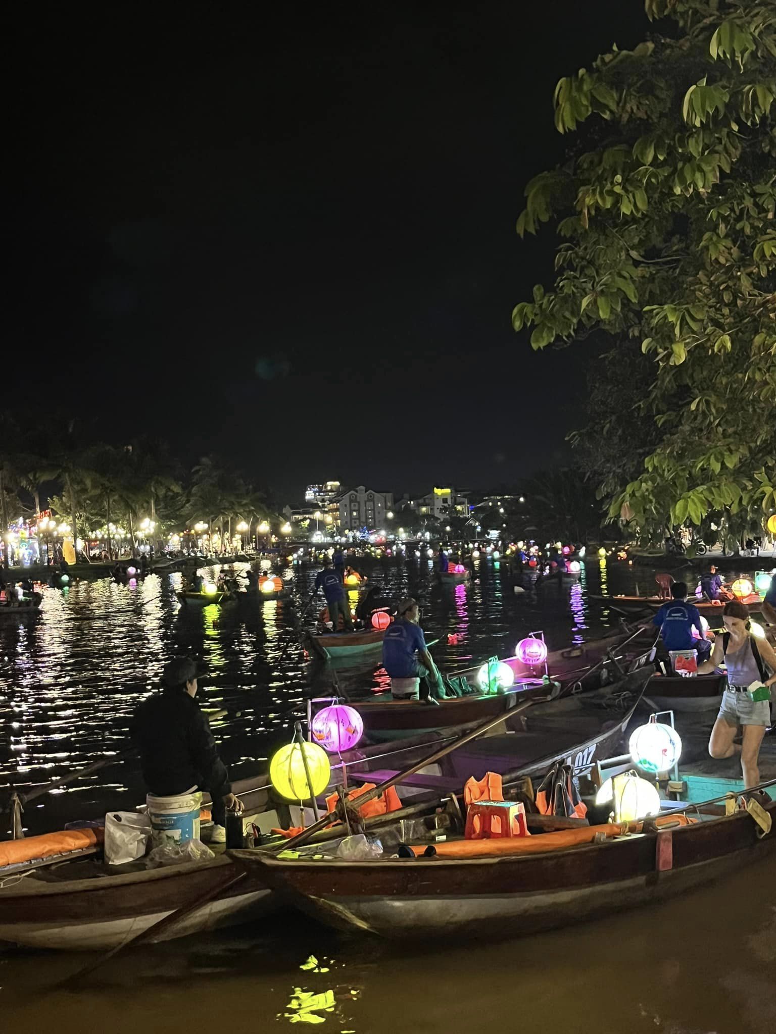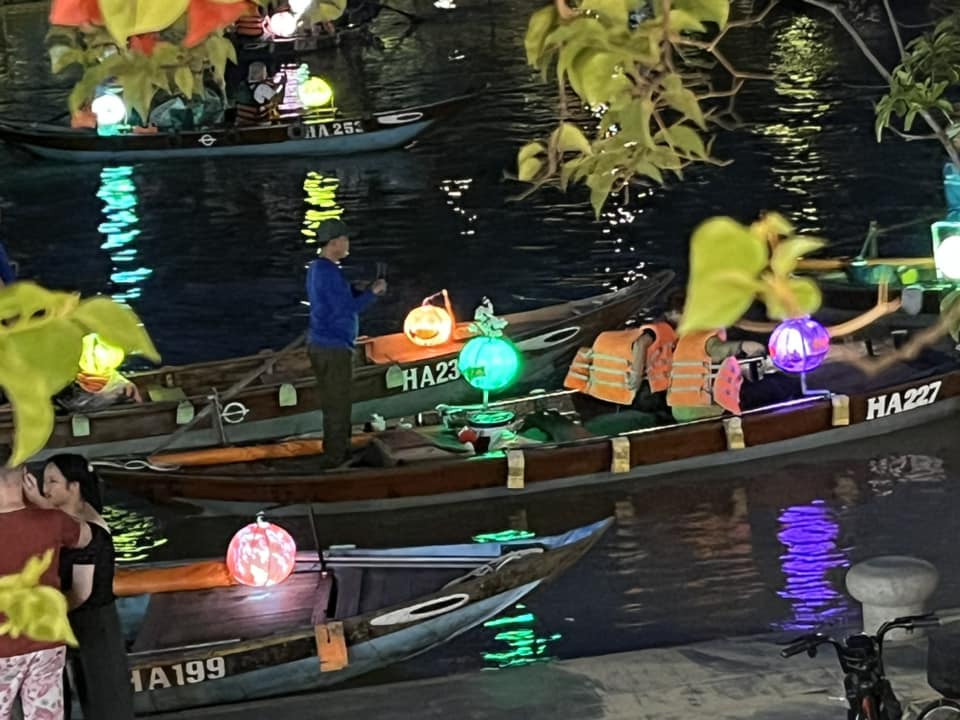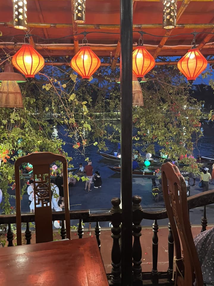 ランタンを乗せた舟たちが見える川沿いのレストラン