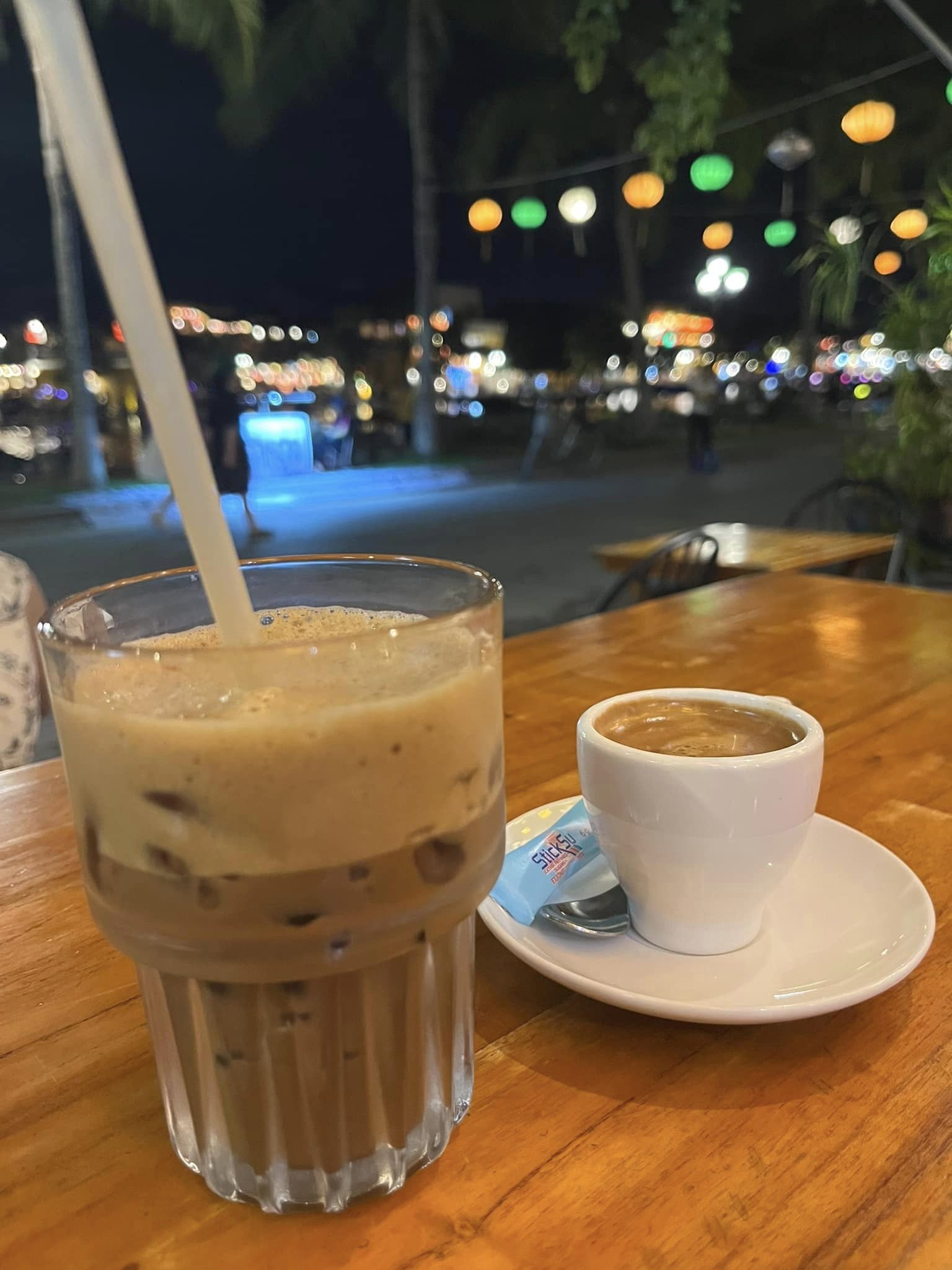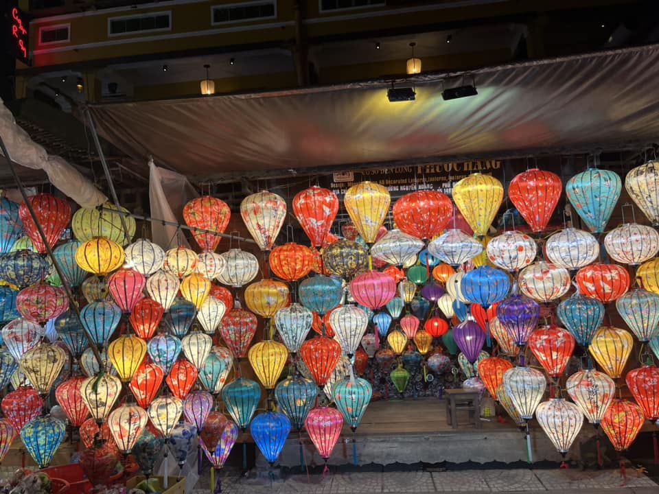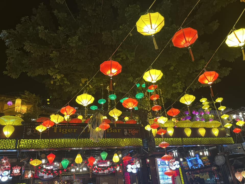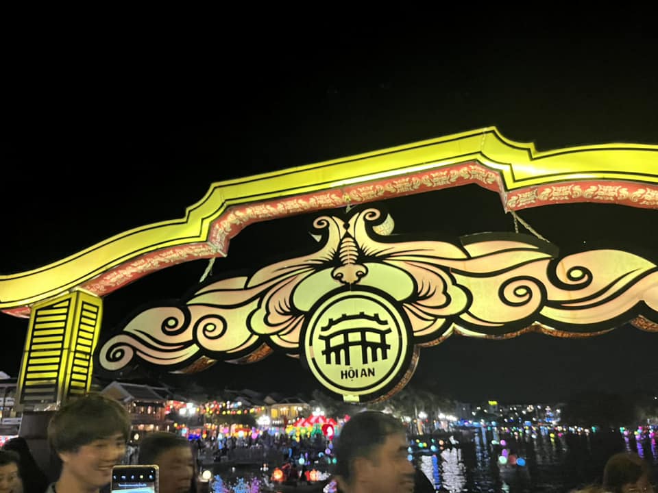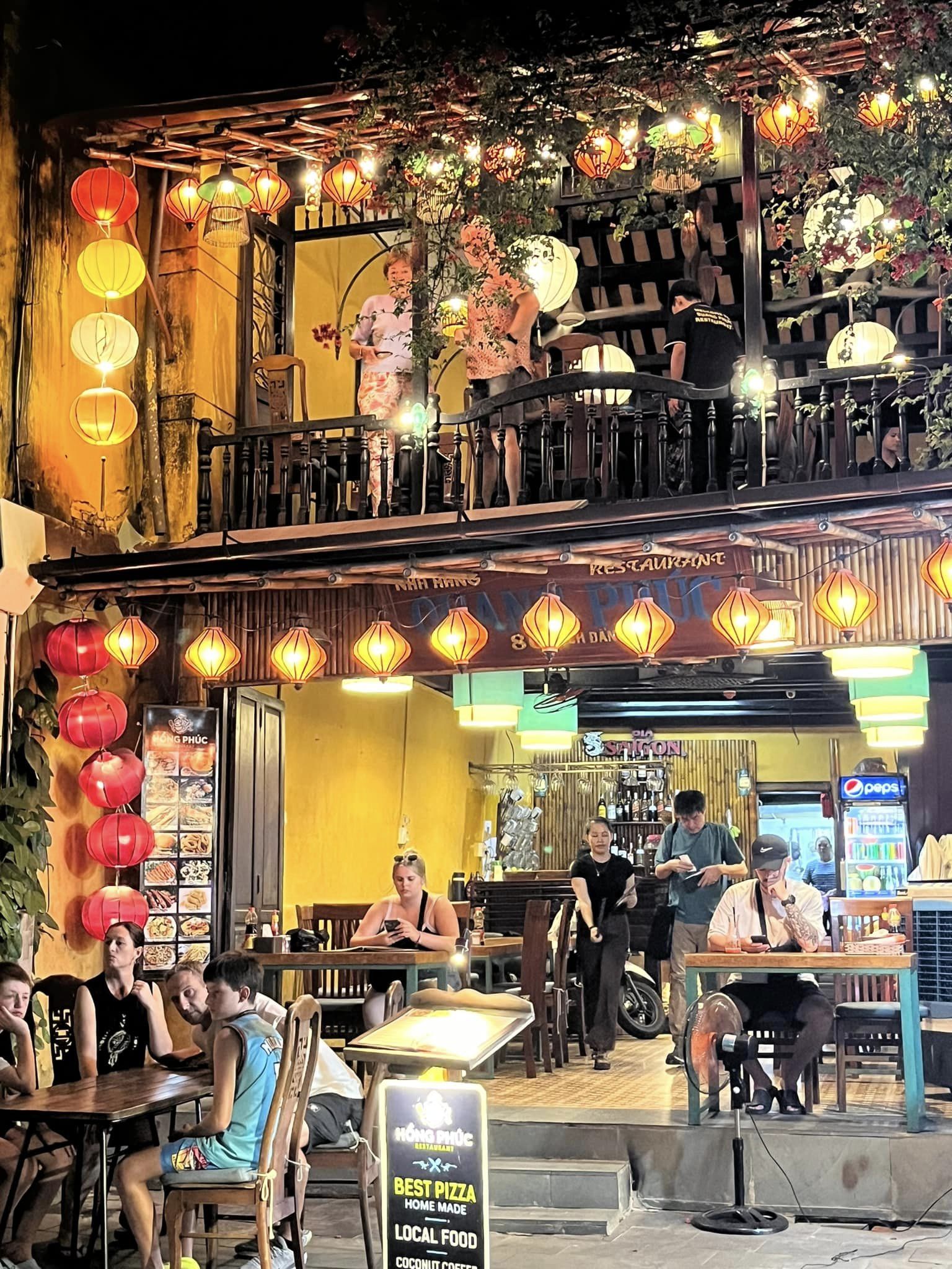ランタンを乗せた舟たちが見える川沿いのレストラン