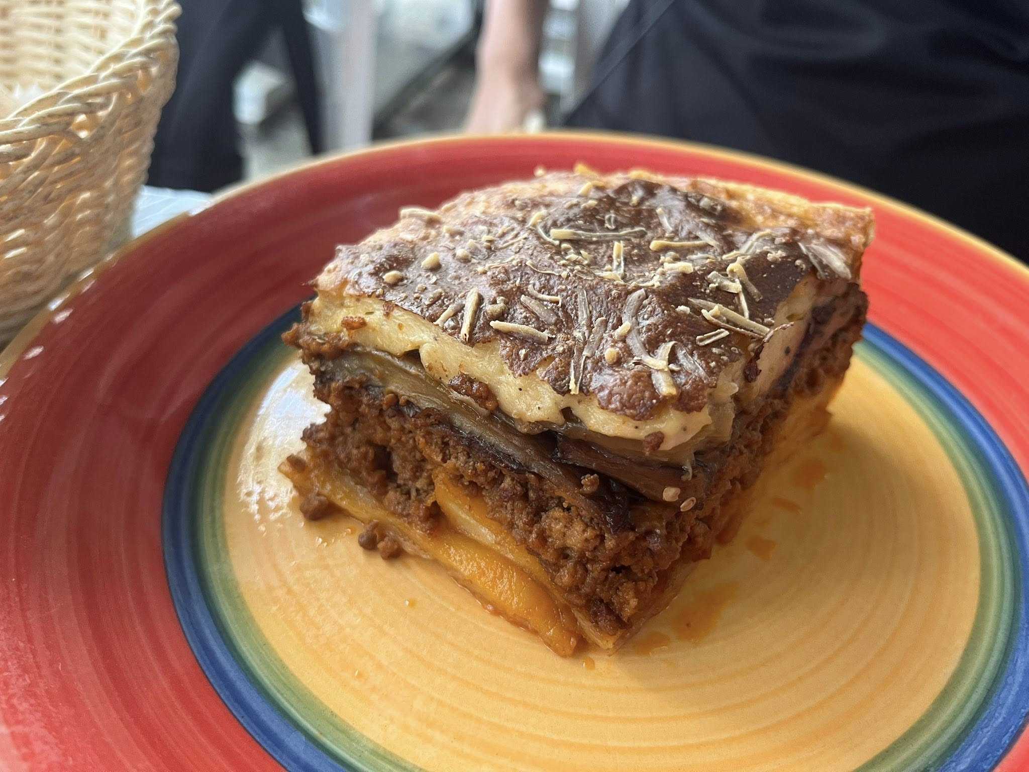 ムサカはマッシュポテト、トマトで煮込んだ挽肉、茄子、ホワイトソースに