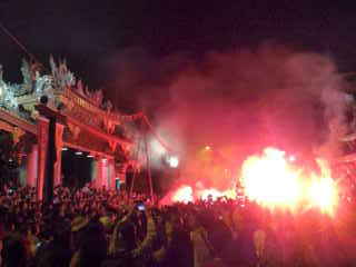 爆竹や花火、発炎筒が木造建築物の周りでこれでもか、と大量に使用されています。お寺の周りではデコトラの様な電飾車が伝統的な中国音楽を奏でる演奏隊を載せゆっくり行進、中にはボリュームMAXでダンスミュージックをかき鳴らしている車もありました。あまりのパワーと音に圧倒され、思わず笑顔になってしまいます。屋台で買った果物を食べながら2時間ほど行列について回りました。携帯電話のカメラを持って上を見上げたら花火の殻が顔に落っこちてきました。危ないので木の下に避難、、、地面のダンボールは打ち上げ花火が入っていたものです。ここから発射!ビデオも撮影したのでそのうちアップしますね。