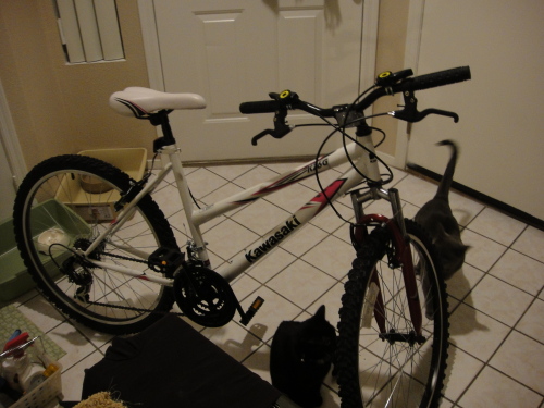 Nyackさんは、マウンテンバイクのタイヤの臭いをしきりに嗅ぎまわっていました。ロシアンブルーのグロックはタイヤの凸凹部分を引っ掻いていました。タイヤ好き猫