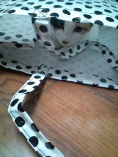 三毛猫って迷彩なのですね、、、。台所でゴソゴソ動き回るのは、妖怪ネコブクロ!何でこうも、袋の中が好きなのでしょうか。ケージに入るのは嫌がるのに袋は自分から突入します。草間彌生のアートになったつもり?