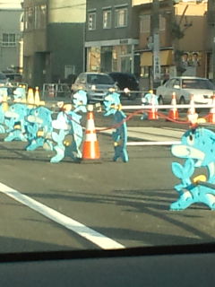 何故か、富山市内で道路工事をしている所にはキリン、謎の怪獣のようなキャラ、イルカ、サルらしきモノが設置されています。交通渋滞のイライラを取り除こうとしているのでしょうか?