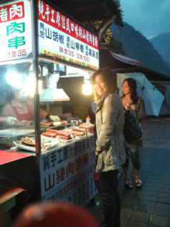 台北近郊の温泉は結構沢山あります。こちらは山の中、少数民族が住む烏来(ウーライ)です。食事、家族用お風呂の日帰りコースで二人888元、周辺は吊り橋や滝、お土産屋さんなどもあるので1泊しても良いと思います。猪の串焼き150元は細かく切ってもらえました。ソーセージは3本100元、3種類味が選べます。普通のとお酒に漬けたのと、山椒のようなスパイスが効いたもの、勿論全て購入!どれも美味しかったけど、私はお酒&スパイスが好みでした。日本に持って帰れないのが残念!!!日本とアメリカに留学していて現在は韓国在住のDoreenが私の旅行に合わせて台湾に来て、色々案内してくれました。謝謝!!!