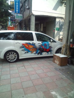 台湾で散歩していたら、車の横だけでなく、前にも後ろにも立派なマジンガーZがペイントしてある車を発見!その後、デパートに行ったら、某ブランド店で売れ行きNO.1のお薦めシャツもマジンガープリントでした。何で?