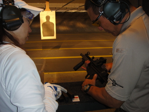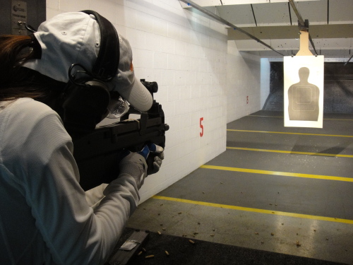 日本から遊びに来た女性がP90射撃を体験しました。銃身が短く、反動も少ないので立って撃てます。